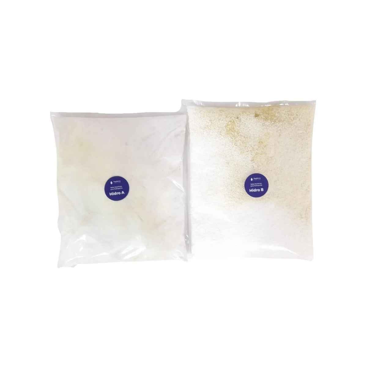 Sales hidropónicas en polvo para preparar solución madre a+b que sirven para preparar 5.000 litros de solución nutritiva. Estas sales hidropónicas pueden emplearse en cualquier sistema hidropónico para producción de hortalizas de hoja. Instrucción de dilución de la solución madre: paso 1. Agregar a 1 bidón de 20 litros de capacidad, 14 litros de agua, luego disolver las sales tipo a y agregar agua hasta completar los 20 litros. Agitar. Paso 2. Repetir el “paso 1” con las sales tipo b. Se recomienda identificar los bidones distinguiendo los tipos a y b, siempre agitar antes de usar. Instrucción de preparación para solución nutritiva (para preparar 200litros de solución nutritiva): paso 1. Agitar los bidones que contienen la solución madre tipo a y tipo b paso 2. En 150 litros de agua, agregar 1 litro del bidón tipo a y 1 litro del bidón tipo b. Agitar el agua del estanque para homogenizar la solución. Paso 3. Agregar agua hasta completar los 200 litros. Paso 4. Controlar el ph de la solución nutritiva agregando nuestros productos para bajar o subir el ph de la solución nutritiva. El ph óptimo está en un rango óptimo entre 6 y 6,5. Paso 5. Agitar la solución nutritiva, se recomienda realizar esto con la misma bomba impulsora. Concentración de nutrientes de la solución nutritiva en ppm (mg/l). Nitrógeno (n) : 150 ppm. Fósforo (p) : 50 ppm. Potasio (k) : 180 ppm. Calcio (ca): 160 ppm. Magnesio (mg) : 35 ppm. Azufre (s): 30 ppm. Hierro (fe) : 1,5 ppm. Manganeso (mn) : 0,5 ppm. Boro (b): 0,5 ppm. Zinc (zn): 0,15 ppm. Cobre (cu) : 0,1 ppm. Molibdeno (mo) : 0,05 ppm.